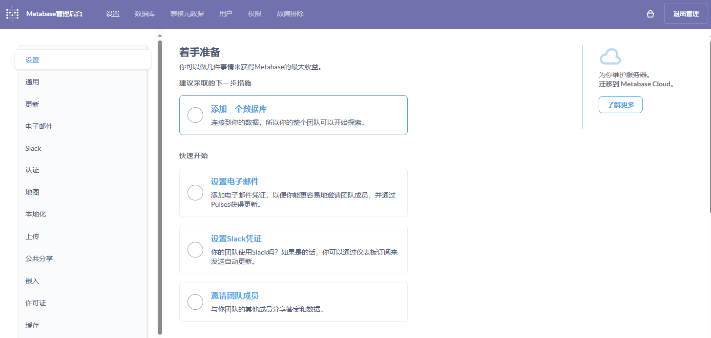 登录到 Metabase 后台后,点击右上角图标选择 管理后台配置 增加数据源