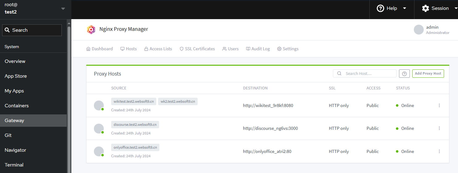 1. Login to Websoft9 Console, open the Hosts > Proxy Hosts of Gateway